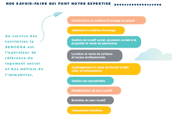 La SEMCODA est unique par la richesse de ses savoir-faire : plus de 170 métiers, de la construction à l’accompagnement social, de l’aménagement foncier à la gestion locative, en passant par la maintenance, les ressources humaines, la comptabilité, le juridique, le financier, l’informatique, la communication ou encore la promotion immobilière. Cette diversité offre à chaque collaborateur un terrain d’évolution professionnel exceptionnel.