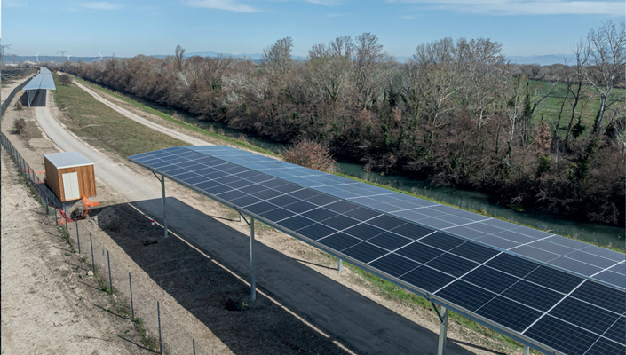 Après avoir construit un démonstrateur d’agrivoltaïsme dynamique avec le campus AgriLyon Vert de Lyon-Dardilly-Ecully, puis le premier prototype français de production d’énergie osmotique dans le delta du Rhône avec Sweetch Energy, CNR poursuit son travail précurseur sur le photovoltaïque linéaire. Dans le prolongement du parc linéaire bifacial vertical de 350 mètres testé depuis 2021 à Sablons en Isère sur une digue du Rhône, CNR relève désormais le défi du linéaire longue distance. Le concessionnaire du Rhône s’est entouré d’un consortium d’entreprises et d’instituts de recherche français (Nexans, Schneider Electric, SNCF, SuperGrid Institute) pour construire un nouveau parc photovoltaïque linéaire expérimental dans le Vaucluse. Depuis l’été 2025, ce parc longiligne composé d’ombrières solaires recouvre sur près d’un kilomètre la « ViaRhôna », la véloroute qui longe le Rhône.